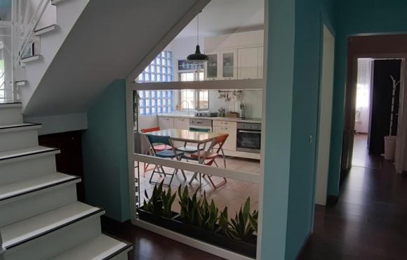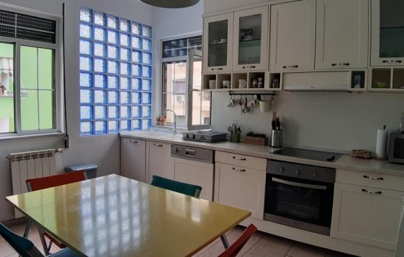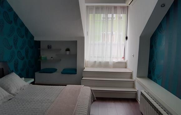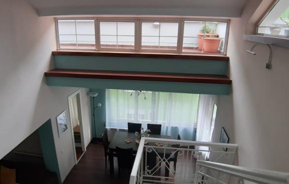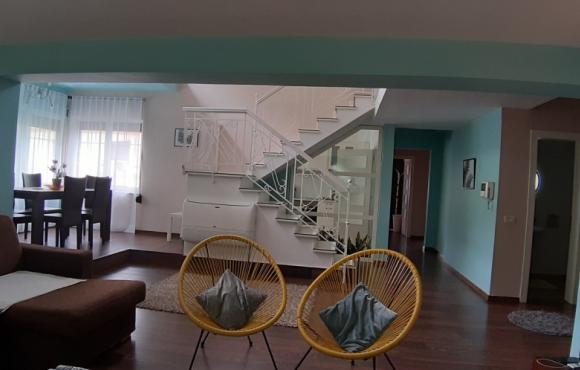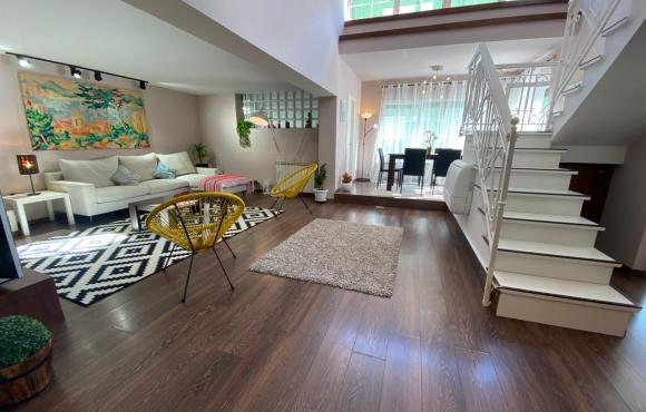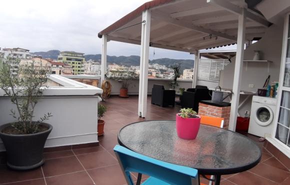 Duplex Penthouse Apartment for rent with a big terrace, situated on the last 2 floors of a well maintained building, ion a quiet area beside the "Blloku" area. With a surface inside of approximately 200 m² and the terrace of 70 m², this apartment is composed of the large living area in the first floor together with the dining zone, and in this living area there is also a very nice and functional fire place which warms the living zone, the kitchen separated and completed with all the needed appliances and kitchen utensils, 2 bedrooms and 2 toilets. While in the upper floor, so the last floor of the building, there is the master bedroom with the private toilet equipped with a bathtub. From this last floor there is access to the big terrace which offers a fantastic view. The whole apartment is equipped with the A/C system and it has also the central heating system with gas. The floors of the main areas are paved with wood parquet. It is fully furnished. Coming up again available for rent from August 2022.