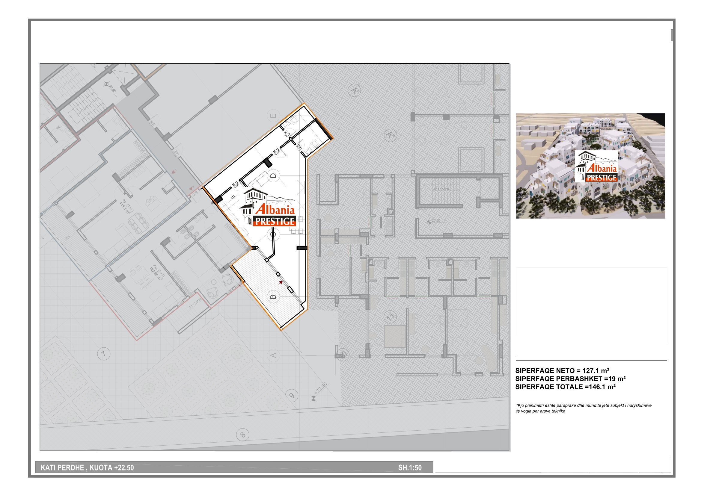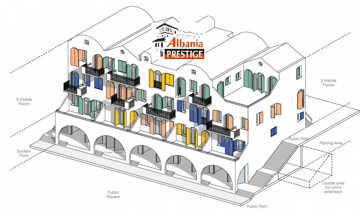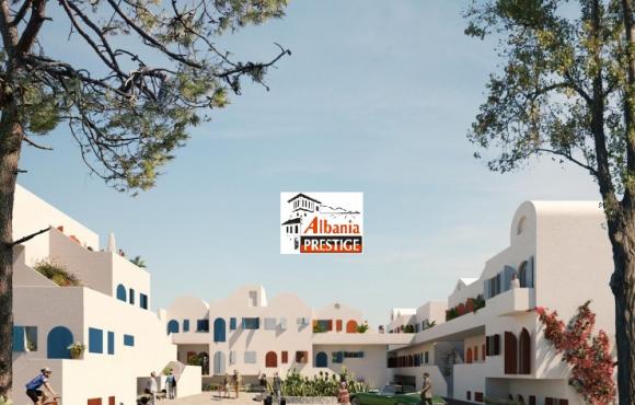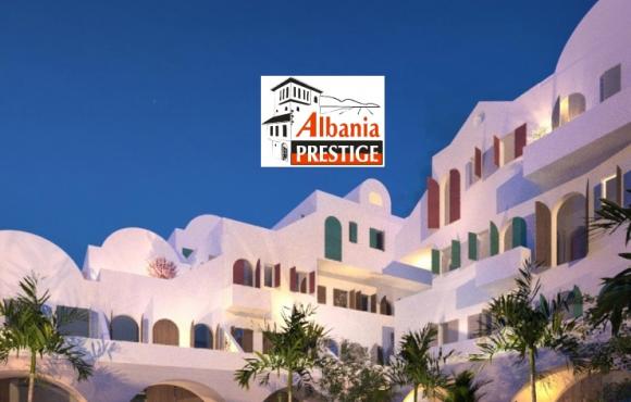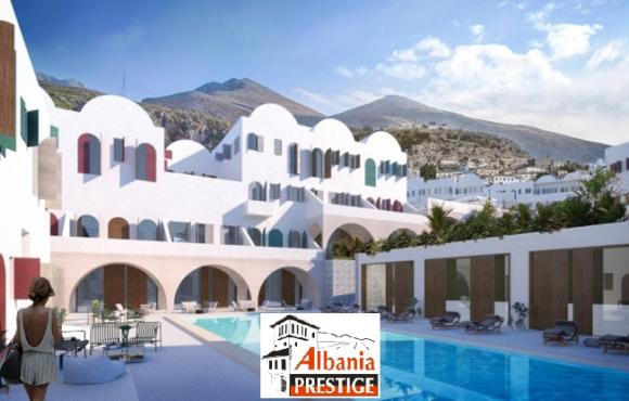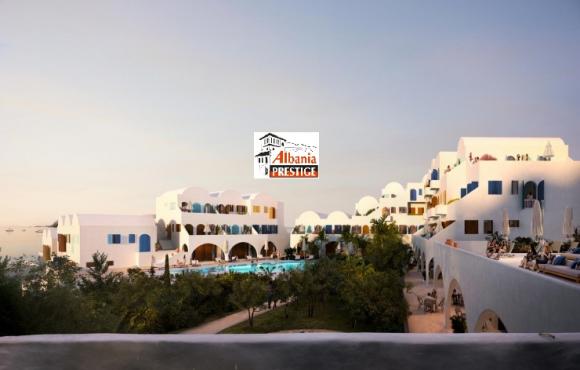 Ne zonen bregdetare te “Drymadhes”, Dhermi, e konsideruar nje nga me te bukurat dhe perlat e bregdetit tone ne Jug te Shqiperise, e cila laget nga Deti Jon, po merr jete nje nga projektet me te vecanta dhe shume terheqese jo vetem ne zone por edhe ne gjithe vijen bregdetare tonen. Projekti “Santorini”, frymezuar nga bukuria dhe hijeshia e vete ishullit ne Detin Egje, do te jete nje nga komplekset residenciale dhe resortet turistike me te rendesishme dhe pike reference e turizmit elitar te brigjeve tona. Kompleksi eshte i kompozuar nga disa godina te ndryshme, te pozicionuara ne nivele te ndryshme te terrenit qe ka nje siperfaqe prej 14,140 m2 dhe ne kete menyre krijohet privatesia e duhur e secilit apartament dhe/apo vilete. Krijimi i te pakten 6 shesheve te ndryshme ne kompleks, si dhe i disa pishinave, do te krijojne ne finale nje oborr te madh te brendshem dhe shume te kendshem ku do te krijohet ne harmoni te plote privatesia e cdo njesie banimi me hapesirat publike. Duke ju bashkengjitur vijes se pare te bregut te detit, i jep ne kete menyre nje vlere te shtuar ketij projekti per plazhin qe do te ofroje. Ne kete resort ne kemi kenaqesine te ofrojme per shitje nje njesi banimi/apartament ekskluzive me nje siperfaqe totale prej 146 m2, i pozicionuar ne katin perdhe te njeres prej godinave me nje cmim shume preferencial qe padyshim po konsiderohet si nje cmim okazion ne kete faze te projektit. Projekti i pare i ketij apartamenti eshte menduar per tipologji 1+1 duke krijuar hapesira te bollshme dhe mjaft komode te ambjentit “living” sebashku me kuzhinen dhe zonen e ngrenies si dhe te dhomes se gjumit dhe verandes shume terheqese. Por, duke qene ende ne faze punimesh, eshte menduar dhe leshtesisht kthehet ne nje njesi banimi/apartament 3+1 pasi dhe vete siperfaqja e brendshme e shfrytezueshme prej te pakten 127 m2 ofron mjaft mundesira te mira per organizime te ndryshme. Projekti eshte ne punime e siper dhe parashikohet te perfundoje Brenda ketij viti 2024.